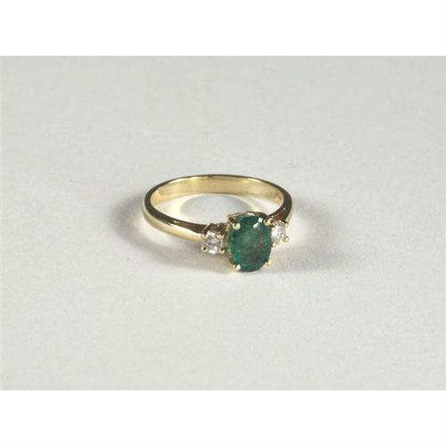 RING: Enticing 14k yellow gold lady's ring set with an oval cut emerald and two round cut diamonds. The medium dark green emerald measures approximately 0.85 cts and is translucent. The diamonds measure approximately 0.20 ctw, have I1 to I2 color and I clarity. Appraisal included.