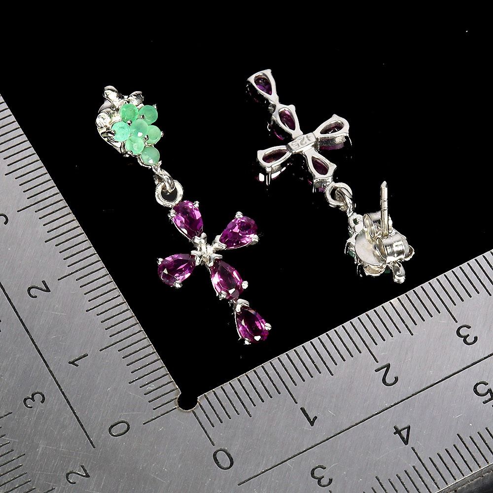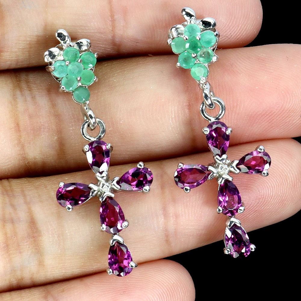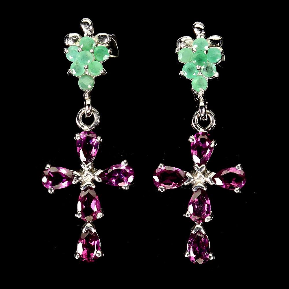 EMERALD AND RHODOLITE GARNET CROSS EARRINGS IN 14K WHITE PLATED GOLD OVER 925 STERLING SILVER - APPRAISED REPLACEMENT VALUE CAD 990