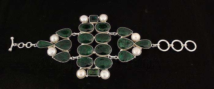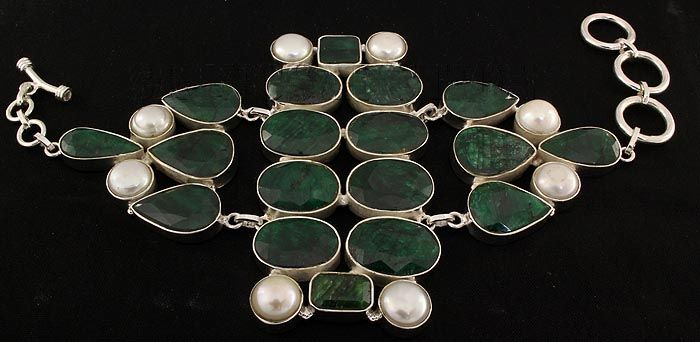 EMERALD BERYL 74.95GRAMS FASHION SILVER BRACELET **|**|** 7.5X3.0 INCHES MIX SHAPE EMERALD BERYL W/ FRESHWATER PEARLS SILVER BRACELET ; MSRP: $2200