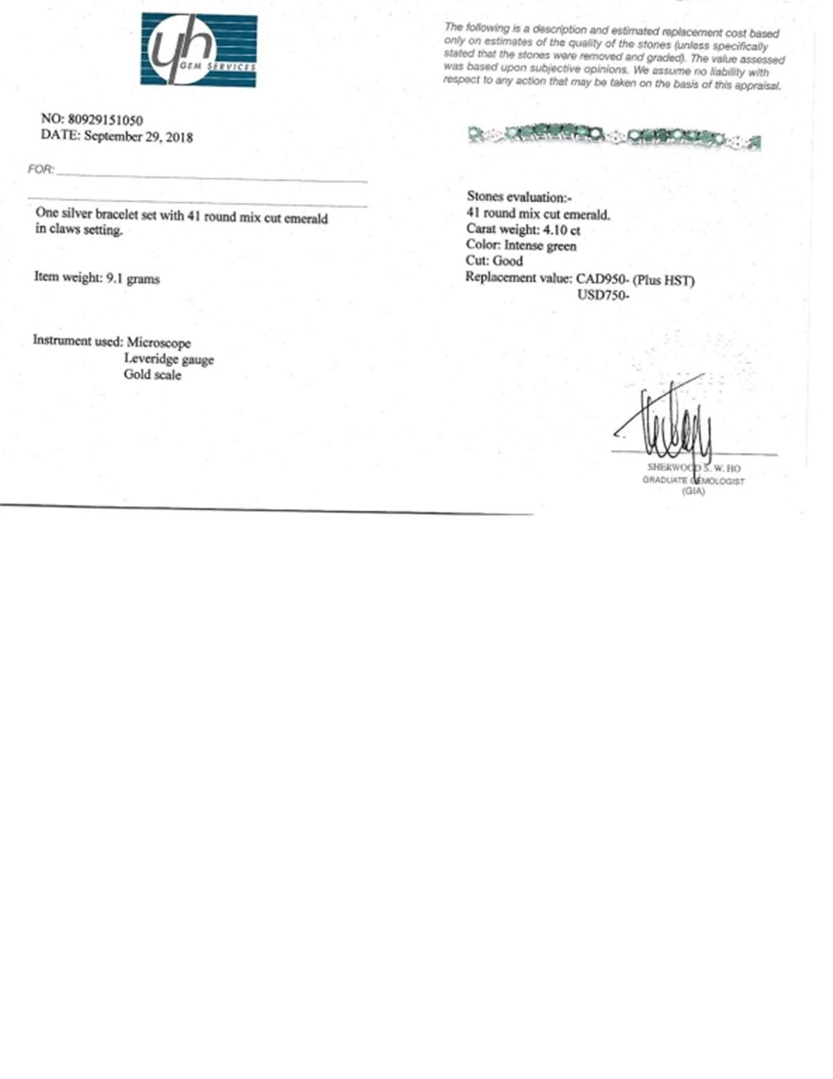 SILVER EMERALD (4.1ct) BRACELET (WEIGHT 9.1g). INSURANCE VALUE $950 ESTIMATE $850 - $950.