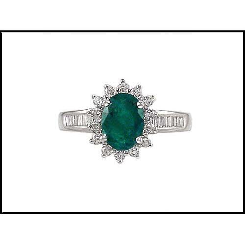 An elegant classic ring of solid 18K white gold is set with a deep mint green natural emerald center stone weighing 1.25 carats. The border of sparkling white round diamonds and with baguette diamonds on the shoulders (over 1/3 carats t.w.) is perfect, elegant contrast for the center gem. The ring is 12.5 mm (1/2") at the center. The emerald measures 8mm x 6mm.