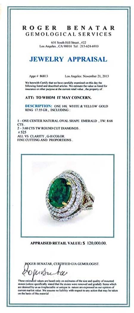 EMERALD OVAL 8.68CT, 14K W/Y/G RING 17.55GM / DIAMOND 3.68CT