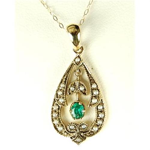 This ANTIQUE VICTORIAN Style Necklace Lavalier is an Authentic and Accurate copy of one from the 1900's but THIS one is in MINT condition. It is 9K GOLD and it features a round EMERALD surrounde by SEED PEARLS. This lovely Lavalier Pendant is 1 1/8 inch in height and it is suspended from a 14k Gold Chain 18 inches long.
