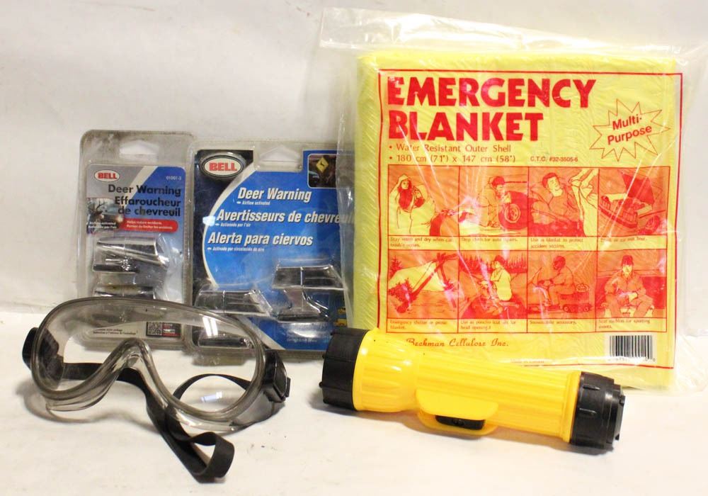 EMERGENCY BLANKET, FLASHLIGHT, DEER WARNING