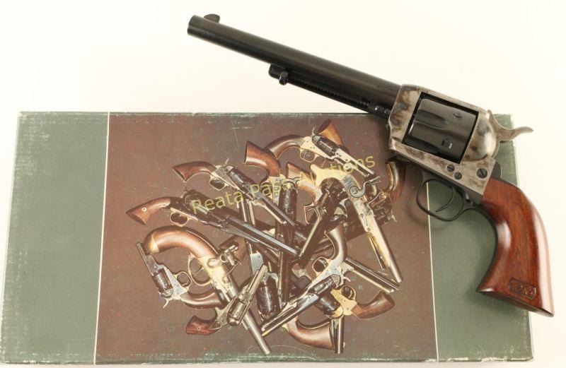 Fine modern reproduction of the Colt Cavalry Model Single Action Army, produced by Armi San Marco in Italy and chambered in .45 Colt. Features a blued/case hardened finish, 7.5" barrel, blade front sight, 'v' notched rear sight, bulls eye ring ejector, fluted six-shot cylinder, 'blackpowder' style frame stamped "U.S.", checkered hammer spur, and one-piece varnished walnut grip with "APC" cartouche on the left side. Includes a factory cardboard box with fitted foam inserts and documents. Revolver exhibits approximately 99% of it's original finish showing very few light handling marks. Action is crisp, bore is excellent and wood grips are fine. Condition is near new in box. ***Modern Firearm*** Note - This revolver has a consecutive numbered counterpart #SA803 in this auction.