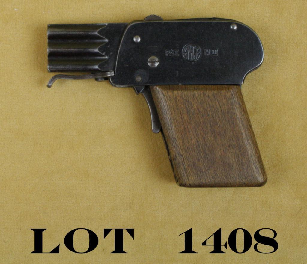 EMGE O/U starter’s type gun, 1-1/2” barrels (not bored thru with “vents” on the top of the barrels), blue finish, smooth wood grips, #NVSN. This gun is in overall fair condition with two triggers and work needed on theactions as they do not stay on full cock. Est.: $50-$100.
