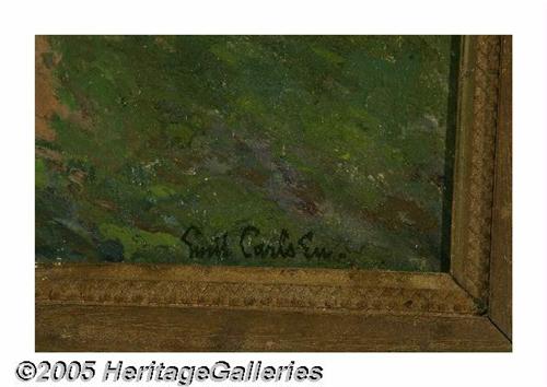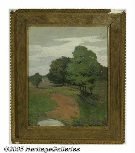 <B>EMIL CARLSEN (American 1853-1932)</B></I><BR>Landscape with Trees<BR>Oil on canvas<BR>20in. x 16in.<BR>Signed lower right<BR><BR>Condition Report: Unlined original canvas, puncture lower center has been patched and overpainted, puncture in top right corner repaired and overpainted, some overpaint in trees along bottom edges, minor touchup in sky, canvas is rippled along right and left edges, overall surface dirt.<BR><BR>David Dike: Agree with description, condition and value estimate. Inpainting to upper right corner.<BR>Brian Roughton: I doubt this is a Carlsen.<BR>