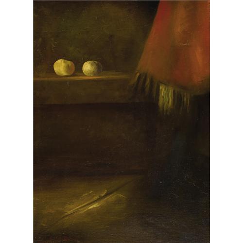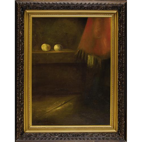<B>EMIL CARLSEN</B></I> (American 1853-1932)<BR><I>Still Life With Garlic On A Ledge,</B></I> circa 1920s<BR>Oil on panel<BR>33 x 24-1/2inches (83.8 x 62.2 cm)<BR>Signed in full at lower left: <I>Emil Carlsen</B></I><BR><BR>This enigmatic and sophisticated late work by the Danish-born painter Emil Carlsen combines his lifelong interest in the evocation of mood and the emotional tension that can be evoked through the powerful presence of a still-life object. In this sizable easel painting, Carlsen obscures the boundaries between landscape (albeit an interior environment) and still life-his two specialties as a painter: most of the image is suffused with a ruddy darkness reminiscent of Rembrandt's work. The very spare interior space he has portrayed is activated by a shaft of light which comes from outside the scene in the manner of Caravaggio. It strikes two round objects on a plain wooden ledge, giving them a solemn plasticity and importance beyond anything they might actually represent. Are these onions or heads of garlic-two herbs Carlsen frequently included in his kitchen still lifes from the 1880s on-or are they apples blanched by the light, or possibly two hard rolls of bread? Regardless, they suggest the presence of someone who set them there, and who might still be present beside them in the fringed, red woolen shawl to the right. The shaft of light then moves past the bench to strike the stone floor below, illuminating the groove between the two pieces of pavement, calling sharp attention to the gash. The scene is intentionally mysterious, a suggestion. The viewer is at liberty to fill in the details.<BR><BR>Both shadowy and radiant in its palette and attention to the fall of light on form, this meditative still life is the work of a mature painter who, during the course of his career, made a very careful study of the Old Masters as well as the Impressionists. During the 1870s, following a brief return trip to his native Denmark, Carlsen went to Paris where he stayed for six months and discovered the work of the eighteenth-century French still-life master, Chardin. When he returned to New York, Carlsen began to develop a reputation as a still-life painter, and began producing a wide variety of subjects from Chardin-like fish pieces to kitchen still-lifes with glinting copper pots to arrangements incorporating oriental objects. Commissioned by a dealer to paint saleable flower pieces, he returned to Paris in 1884, where he remained for two years, painting numerous brightly-colored pictures and adopting an impressionistic palette. Eventually, he grew tired of this repetitious work and broke the contract he had made with the dealer. Carlsen went back to New York and opened a studio on West 57th Street. He worked there until 1887, when he began a two-year tenure as director of the San Francisco Art Association's school. He resigned this post in 1889 but remained in San Francisco until 1891.<BR><BR>Carlsen settled again in New York in 1891 when he began teaching at the National Academy of Design. For the 19 years of his tenure there, he was a well-liked and influential instructor. At this phase of his career, Carlsen became friendly with William Merritt Chase, J. Alden Weir, and Childe Hassam-all of whom worked in an impressionist mode which he, too, adopted at various points in his development.<BR><BR>During his lifetime, Carlsen's still-life paintings were noted for their beauty and elegance, and as one contemporary writer remarked, Carlsen was “unquestionably the most accomplished master of still-life painting in America today." During the 1920s when the present work was painted, Carlsen often painted his still-life subjects on panel rather than canvas.<BR><BR><BR><BR><b>Shipping:</b> Requires 3rd Party Shipping (<a target="_blank" href="http://www.heritageauctions.com/common/shipping.php">view shipping information</a>)