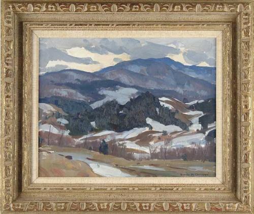 EMILE ALBERT GRUPPE (American, 1896-1978) "THE SNOWY HILLS". Oil on canvas winter scene shows Mt. Mansfield with snow covered valley. Signed lower right and housed in a carved partial gilt wide wood frame with linen liner. SIZE: 16" x 20". CONDITION: Very good. 9-27352