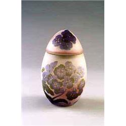 EMILE GALLÉ, Nancy Dose, farbloses, matt geätztes Glas. Partiell lachs- und roséfarbener Innenüberfang sowie opakweißer, violetter und grauer Außenüberfang mattiert, umlaufend geätztes Hortensiendekor mit Binnenzeichnung. Ovoide Form auf flachem Stand. H.: 15,5 cm. Bez.: Gallé (hochgeätzt). Um 1905 Lit.:Blount, Berniece und Henry, French Cameo Glass, Des Moines / Iowa 1968, Abb. S. 57, Nr. 67c (zur Form), S. 49, Nr. 45-46 (zum Dekor).