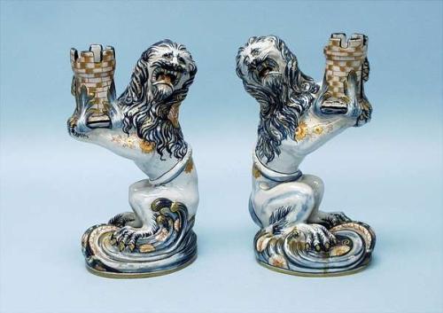 EMILE GALLE and SAINT CLEMENT. An unusual pair of handpainted faience candlesticks in the form of lions. Signed and marked. 9 3/4" high. France, cca. 1920. 4500-5500