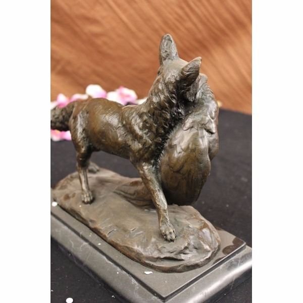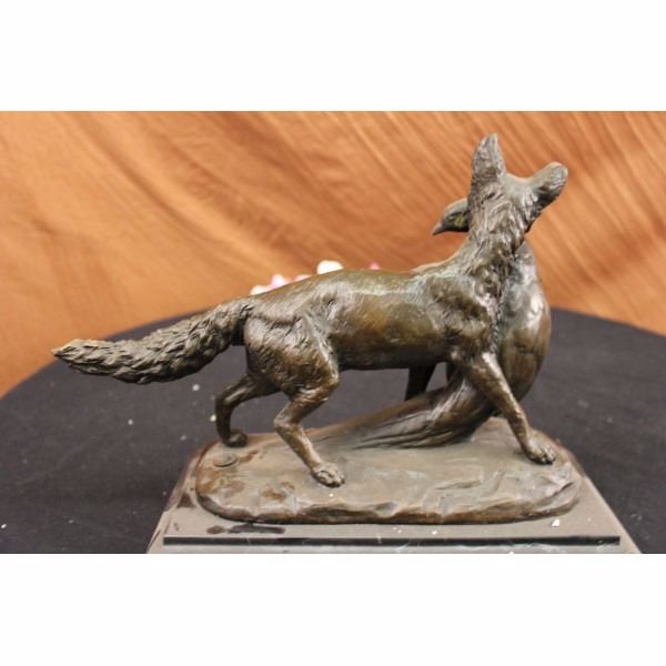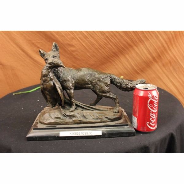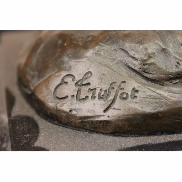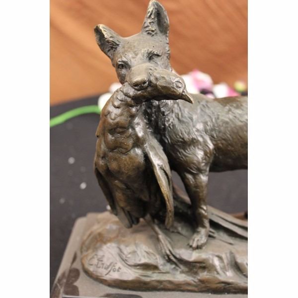 Artist: EMILE LOUIS TRUFFOT (FRENCH 1843-1896)Title: "POACHER " Medium: Genuine Pure Bronze - Lost Wax Process (Cire Perdue) Height: 10" (As each sculpture is individually made, sizes stated are approximate. Measurements of most works are from the bottom of the marble base to the highest point of the sculpture.) Detailed Description : This beautiful bronze figure of a fox and pheasant is mounted onto a marble base, stands 10" high, and is inscribed E. Truffot, dark brown patina. Born in Valenciennes in 1843, Emile Louis Truffot studied sculpture at the Ecole des Beaux Arts in Paris. He exhibited at the Salon from 1863, and he won the Prix de Rome in 1867/68. About the Sculpture: Made in the Europe. certified pure bronze. Featuring recasts of hundreds of significant bronzes. Setting the standard in hand cast bronzes in the superior Lost Wax Process (Cire Perdue). Clay to wax to bronze-the lost wax process is a method for changing a sculpture made of soft clay into a harder material such as bronze, which captures the most minute detail of the artists original work. Practicing in the same manner of the old world masters, with devotion to quality, fidelity and detail. Recasts may be made from originals, reproductions or sculptured after paintings. Our skillful artisans take pride in casting the best foundry bronze. The lost wax process has long been the preferred method of casting bronze sculptures for the finest museums, galleries and premier collections across the globe. There simply is no better way to create artwork in bronze that faithfully reproduces the original object.Condition: This sculpture is in a very Good condition. Bronze Dimensions with Marble Base:Height 10" x Width 13"Marble Dimensions: 11 1/2" X 6"Height without base: 9" Weight : 10 LBSInventory : 2255K16822 Artist: EMILE LOUIS TRUFFOT (FRENCH 1843-1896)Title: "POACHER " Medium: Genuine Pure Bronze - Lost Wax Process (Cire Perdue) Height: 10" (As each sculpture is individually made, sizes stated are approximate. Measurements of most works are from the bottom of the marble base to the highest point of the sculpture.) Detailed Description