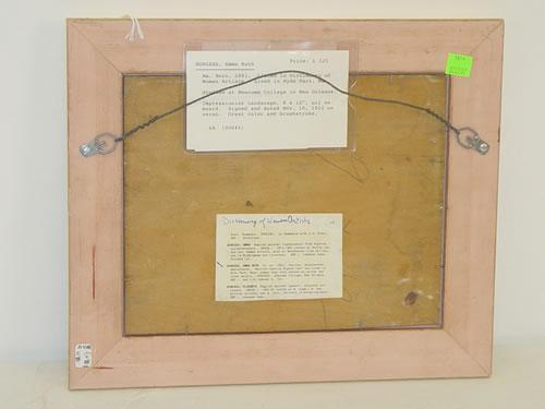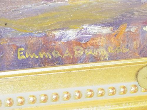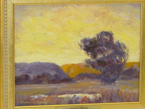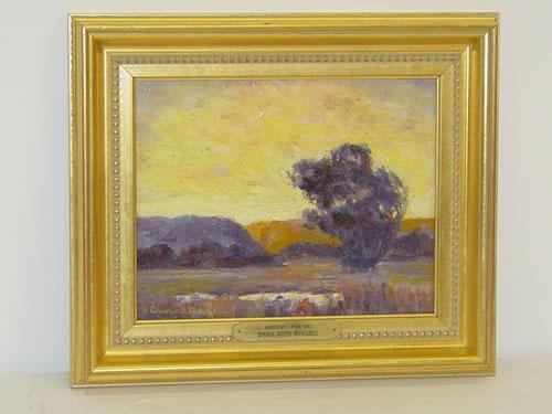 EMMA RUTH BURGESS OIL ON BOARD-IMPRESSIONIST LANDSCAPE AT SUNSET, SIGNED EMMA R. BURGESS ON LOWER LEFT IN A GILT WOODEN FRAME W/ BRASS TAG (7 1/4" X 9 1/4") - NORMAL WEAR, IMPERFECTIONS;
