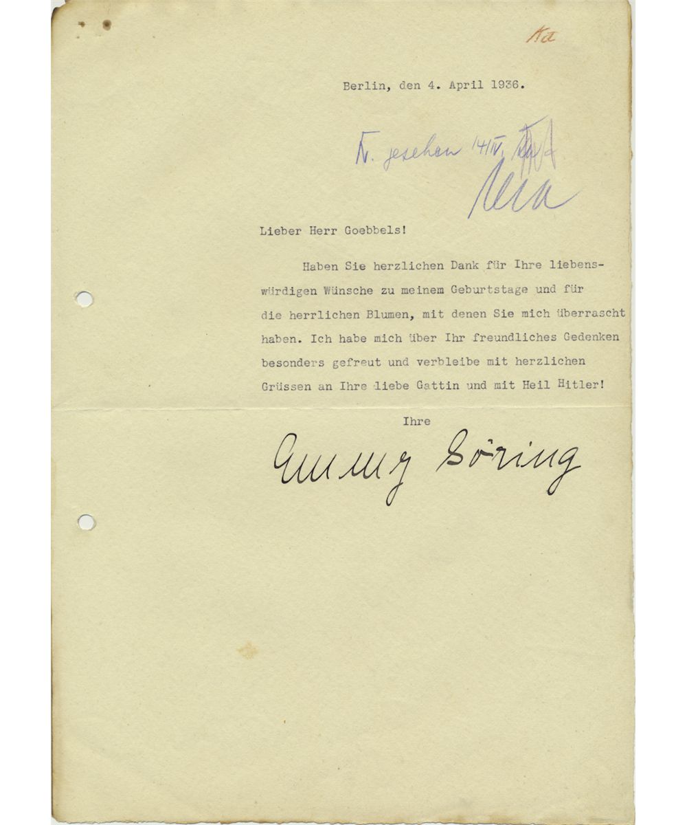 (1893 - 1973) German actress and the second wife of Luftwaffe Commander-in-Chief Hermann Goering. She served as Adolf Hitler's hostess at many state functions, which led to her claiming the title of "First Lady of the Third Reich". Fine association T.L.S., 1p. large 4to., Berlin, Apr. 4, 1936 to Minister of Propaganda JOSEPH GOEBBELS. Goering warmly thanks Goebbels for remembering her birthday and sending her "gorgeous birthday flowers, which surprised me... ". Docketed at top, file holes in blank left margin, else very good.