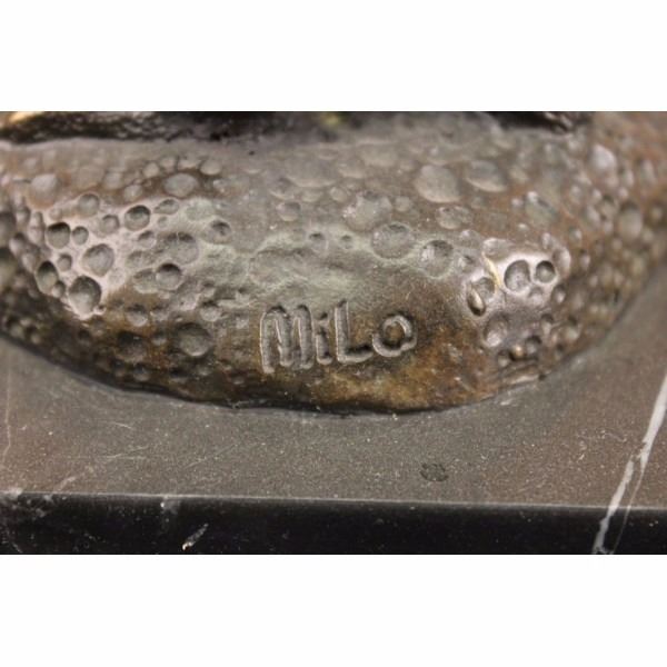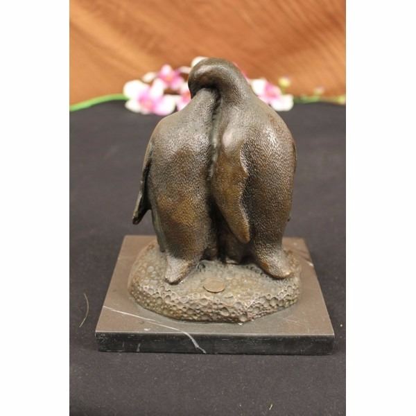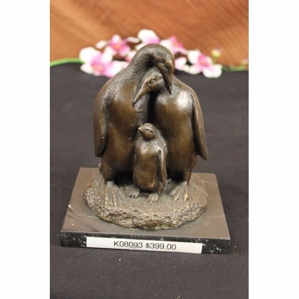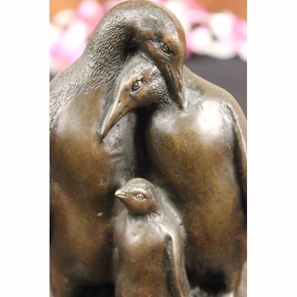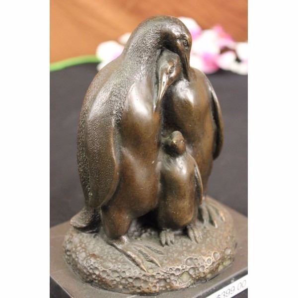 A family of penguins snuggle close to shield away theAntarcticacold. A mother, father and their young hug one another. They rests their heads on each other and shelter their baby. 100% bronze and handmade, this brown patina sculpture was cast using the "Lost Wax Method" and mounted on a marble base and is signed by artist Milo. Condition: This sculpture is in very good condition. Bronze Dimensions with Marble Base:Height 8" X Width 6" Marble Dimensions: 6" X 5" Height without base: 7" Weight : 8LBS Inventory: 73k0804037