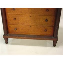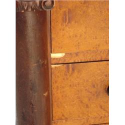 Empire curly maple & cherry 2 over 4 drawer chest. Turned feet, columns, curly maple drawer fronts. Missing veneer on front in 2 small areas. 47.75" H, 44" W, 23.5" D