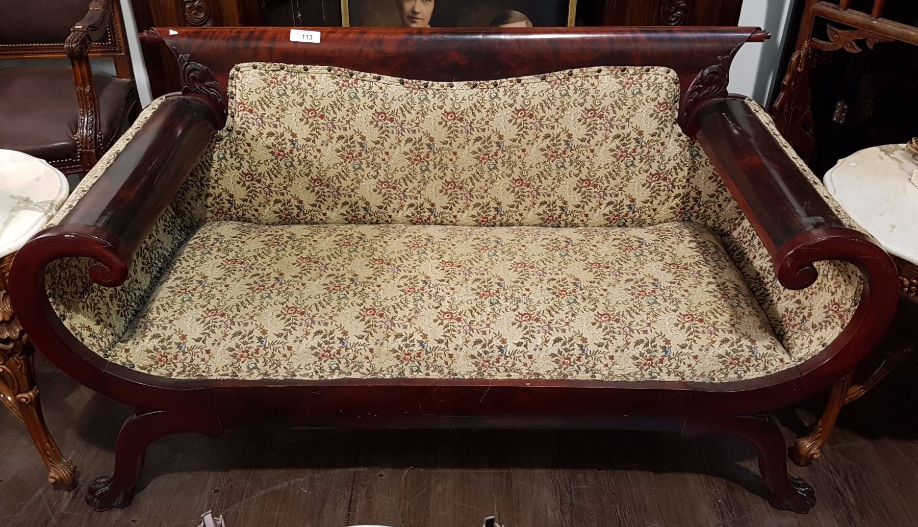 EMPIRE CURVED ARM SETTEE WITH FLORAL BROCADE