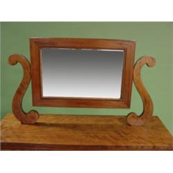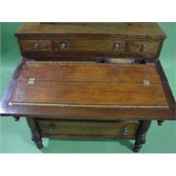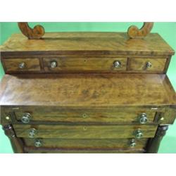 EMPIRE MAHOGANY LADIES WRITING VANITY WITH MIRROR. Fold-down desk lid with leather insert. Two small drawers and one large drawer on top. 4 graduated drawers on bottom. 31" H to top of desk, 56.5" H to top of mirror, 36.5" W, 20" D