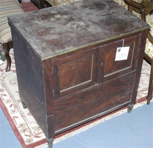 EMPIRE MAHOGANY BIDET with brass mounts and lift top, 26"x18"x27", distressed finish, losses, circa 1820, SHIPPING: See recommended third party shippers. This item can't be packed or shipped by seller.