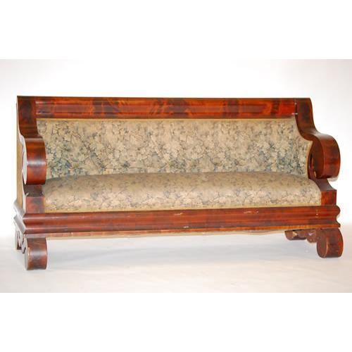 EMPIRE MAHOGANY CLASSICAL SOFA W/ OGEE CREST RAIL & SKIRT, EXAGGERATED SCROLL ARMS & SCROLL BASE W/ FOLIAGE TAPESTRY UPHOLSTERY (40 1/2" T X 81" W X 29 1/2" D) - WEAR, LOSSES, IMPERFECTIONS