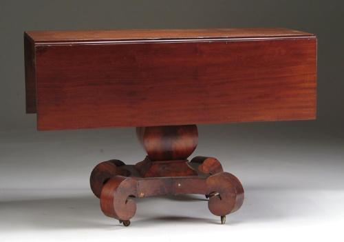 EMPIRE MAHOGANY DROP LEAF DINING TABLE. Straight leaves with swing out arm supports, shaped center column supported by a quatrefoil square leg base. Simulated drawer front to each end. SIZE: 28-3/4in. h x 42in. d x 17-3/4in. (closed); 42-1/2in. (open). CONDITION: Good, some finish fading to one leaf. Minor veneer chip. 9-26125
