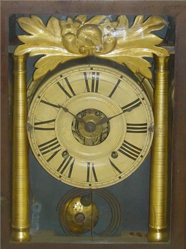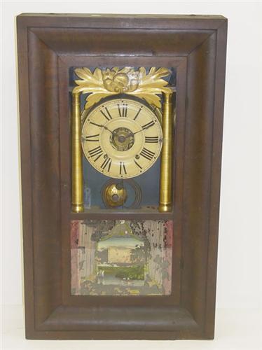 EMPIRE MAHOGANY OGEE SHELF CLOCK W/ REVERSE PAINTED GLASS DOOR TABLET, ARCHITECTURAL INTERIOR & CREST W/ SIDE MIRRORS & J.J. & W. BEAL'S ADVERTISING INSIDE (31" T X 18 1/2" W X 4 1/2" D) - LOSSES TO REVERSE PAINTING, WEAR & IMPERFECTIONS;