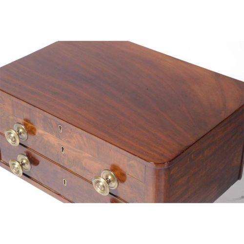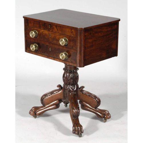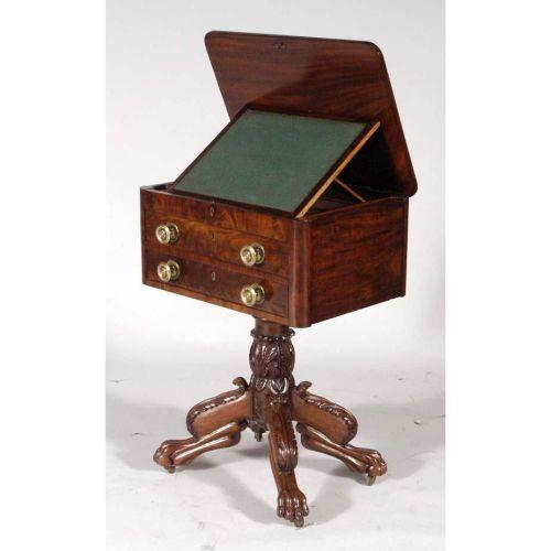 EMPIRE MAHOGANY WORK TABLE with lift top writing surface and paw feet, circa 1820 CONDITION REPORT: refinished, small patch to back of lid.