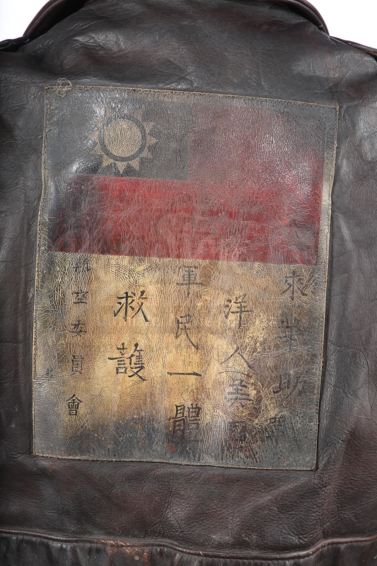 A brown leather bomber jacket made by Schott, the piece features a China Burma India Theater patch on the arm and a large 'blood chit' patch on the back. A black "J" is written in the collar. The jacket is missing its detachable faux-fur collar and displays significant wear from use, including tears to the leather and lining on the left breast pocket, both arms, and to the wool cuffs and waist.