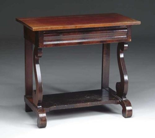 EMPIRE ONE-DRAWER SERVING TABLE. Small table has an ogee type drawer front, S-shaped front supports and a shelf below. CONDITION: Good. 9-27043