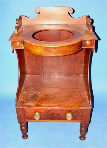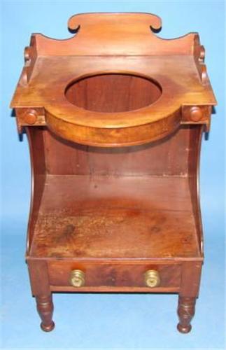 EMPIRE PERIOD WASHSTAND. With dovetailed Gallery over two small dovetailed drawers and one long dovetailed drawer over turned feet. Overall wear to finish 35” H x 20.25” W x 18” D.
