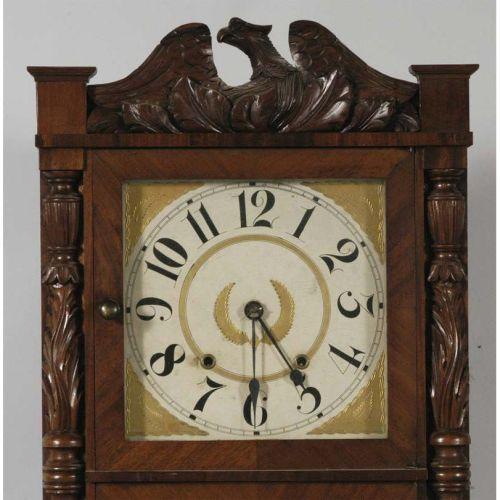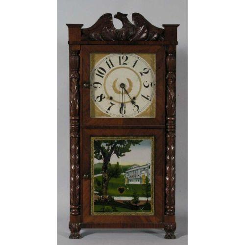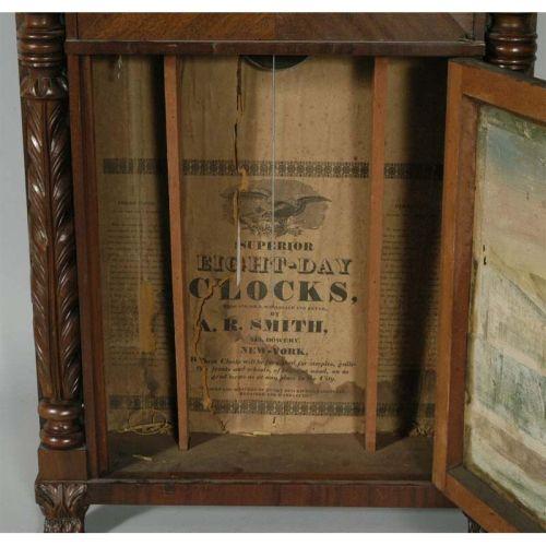 EMPIRE PILLAR & SCROLL SHELF CLOCK labeled R.Smith, New York, eight day wooden works, 35" h. 9" crack bottom glass at top, eagle head broken and glued back, normal paint losses as seen in images