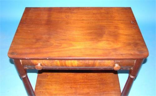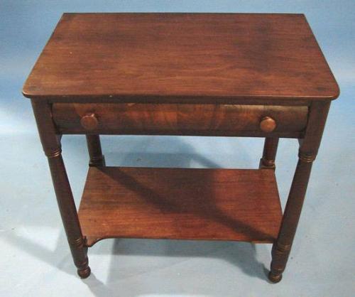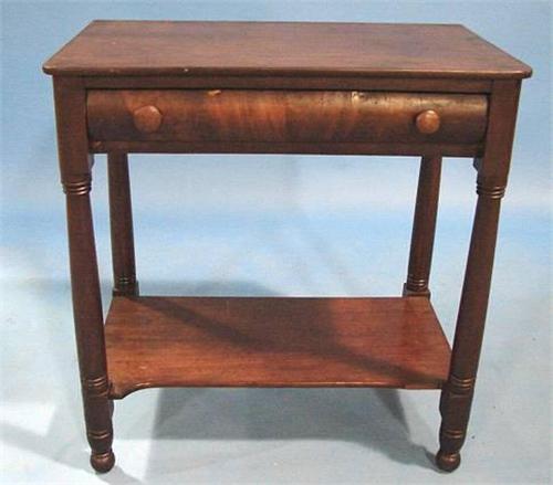 EMPIRE WALNUT SINGLE DRAWER STAND. Has single dovetailed drawer with veneered drawer front. Turned legs. 28.25" H, 27.25" W, 17" D
