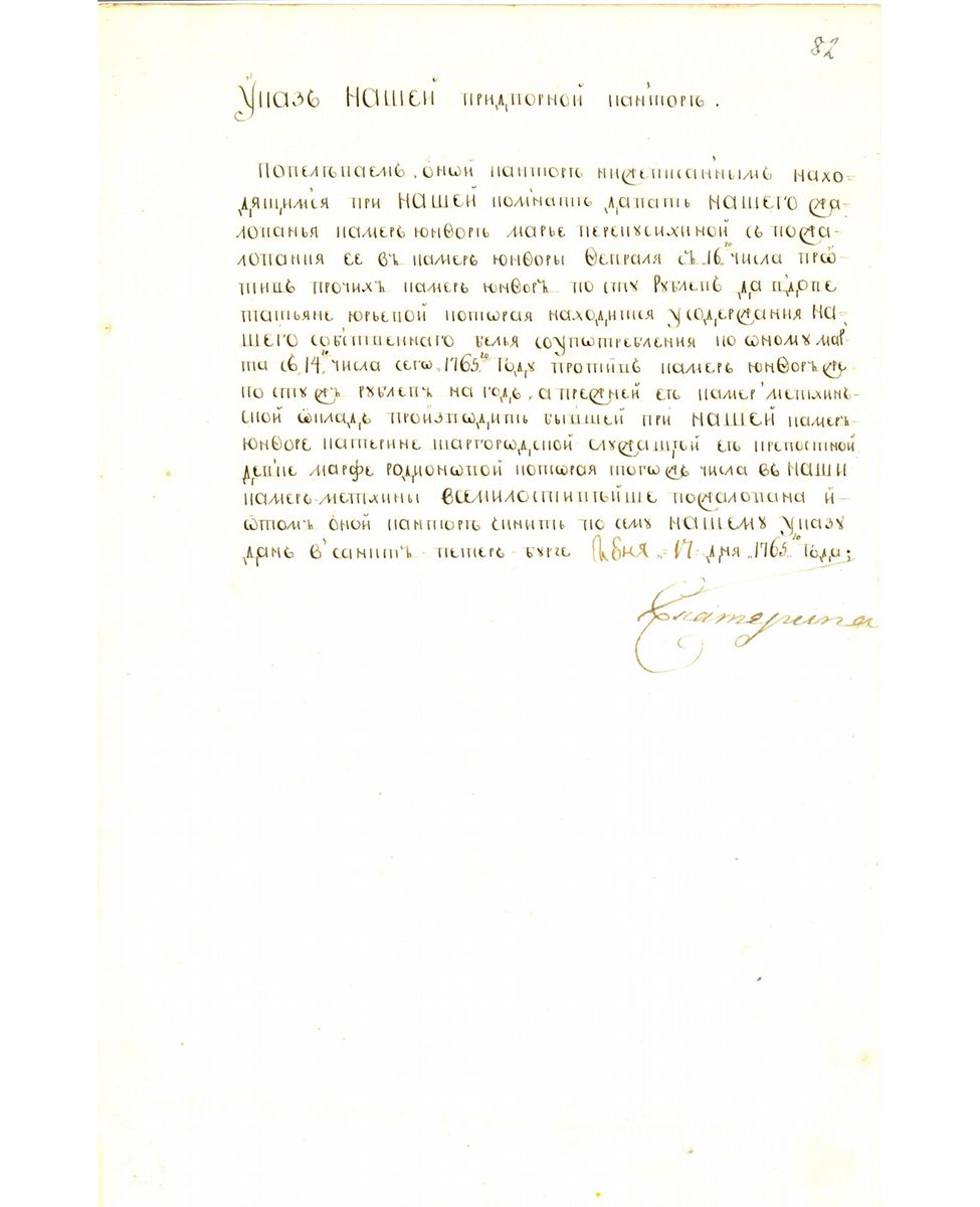 German-born empress of Russia, Catherine the Great, usurped the throne of her husband Peter III Handsome manuscript DS, 8x12.25, 1765, in Cyrillic untranslated. Fine Condition and rare signed document.