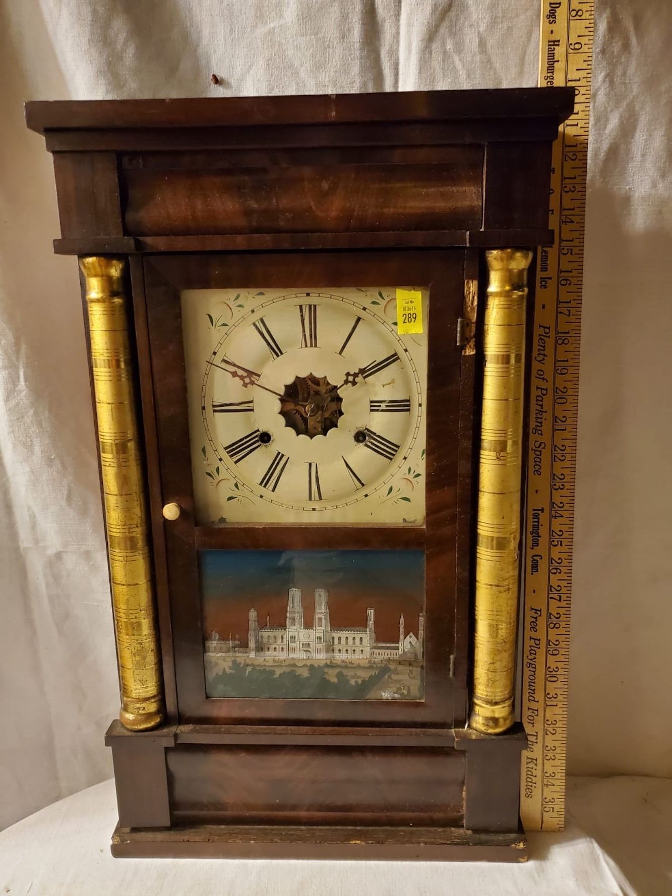 EN Welch weight driven shelf clock with beautiful original glass, gold gilt columns, EN Welch, Forestville, CT