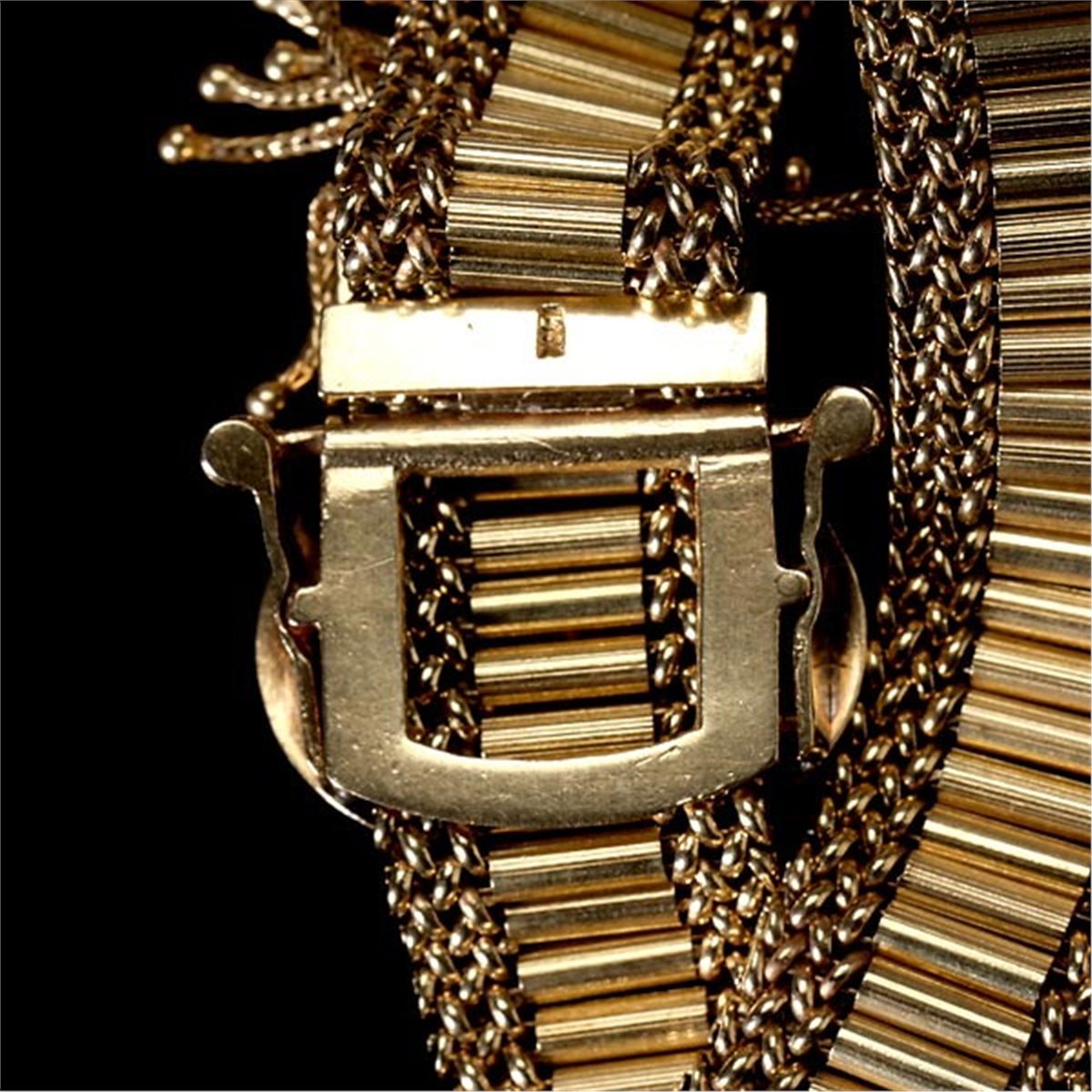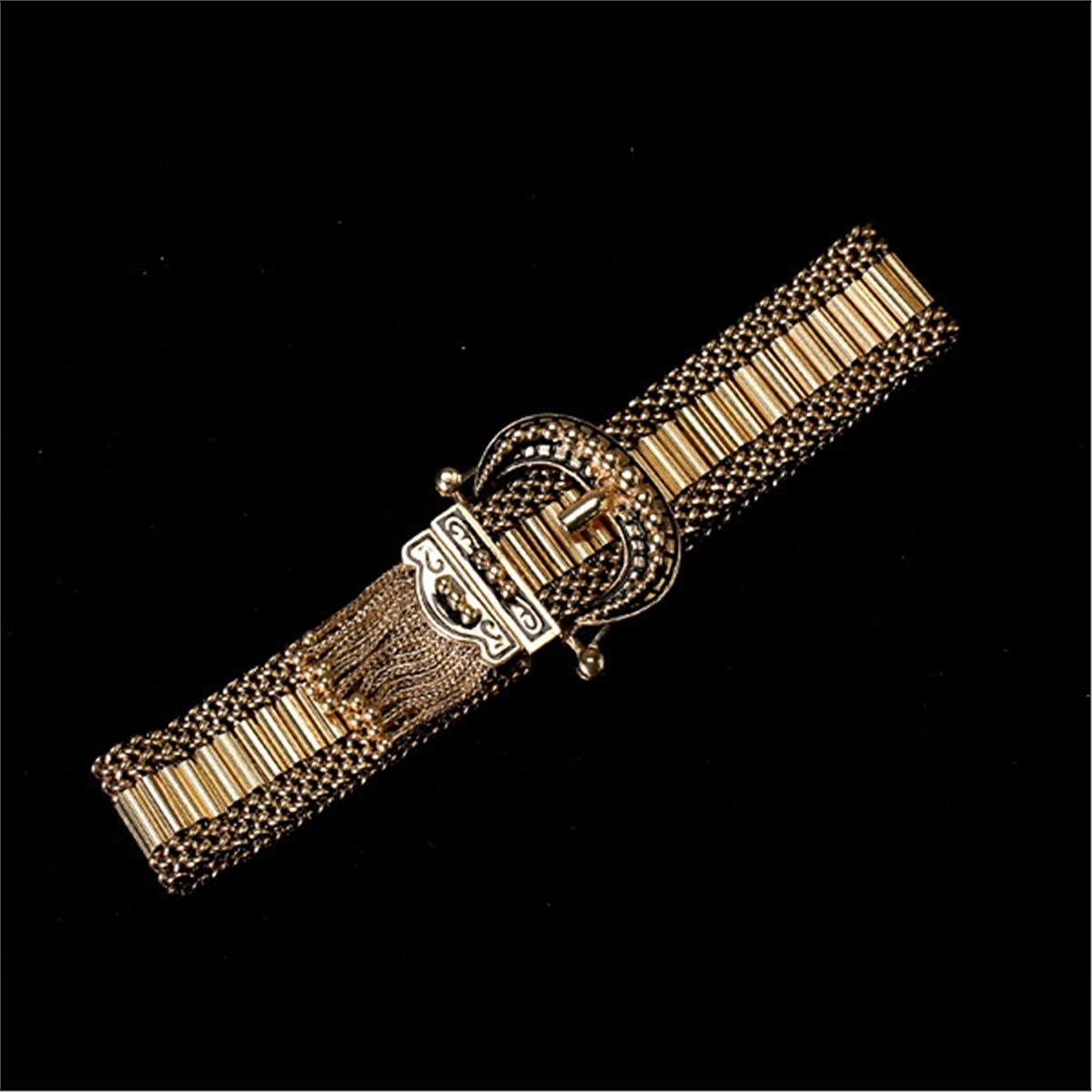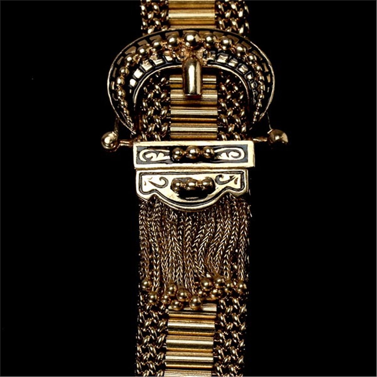 ENAMEL, 14K YELLOW GOLD BUCKLE BRACELET. The 6.00 mm 14k yellow gold bar link is bordered by 4.00 mm mesh link forming a 16.00 mm width, completed by a buckle mounting adjustable clasp accented by black enamel and tassels. 36.00 dwts Note: One tassel is frayed.