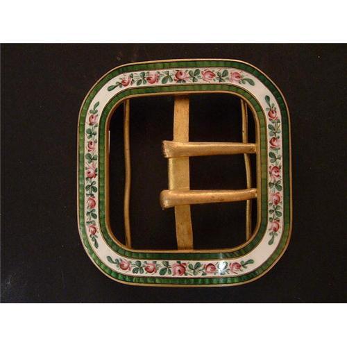 A SPLENDID VICTORIAN ENAMEL BUCKLE. PINK ROSSES WITH GREEN LEAVES ON A WHITE FEILD ENCLOSED BY TWO LINES OF TRANSPARENT GREEN GUILLOCHE ENAMEL. SIGNED "GILT" ON THE BACK.A WONDERFUL ADDITION TO YOUR COLLECTION AND YOU CAN WEAR IT.