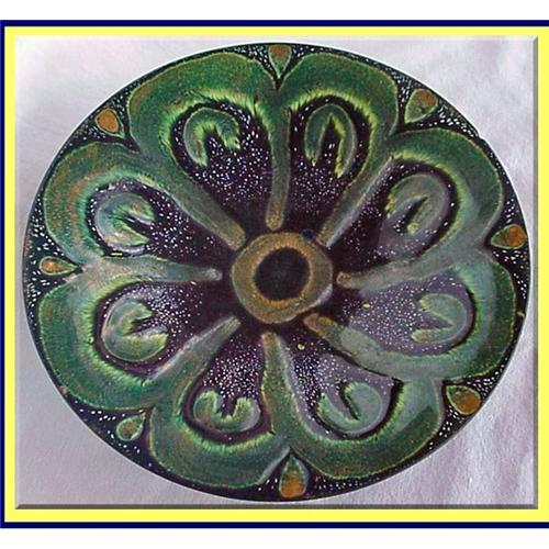 Small round base flaring out and up to form th bowl. Background like a peacock of black flecked with white and over that, slightly raised stylised Palm trees around a ring. The shades of green and gold are very beautiful.