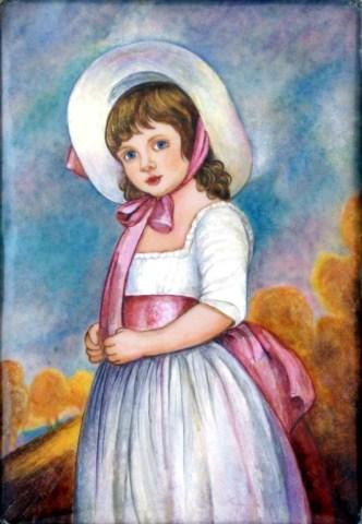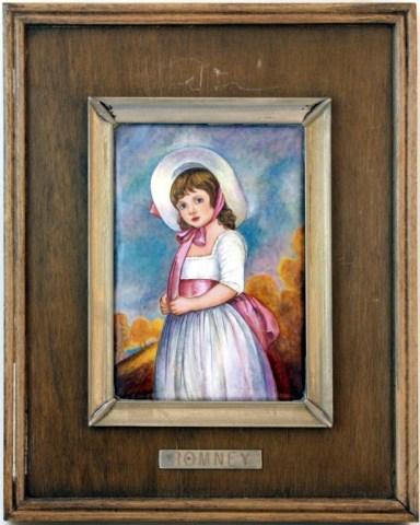 Enamel on silver. Plaque is titled "Romney". Has a five point star silver mark. Made in Spain. 6 1/4" h + 4 1/2" w + 1 3/4" frame.