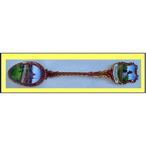 Gilt enamelled souvenier spoon from St. Petersburg, Russia. Very early.<BR>Measures 5 1/4inches long.<BR>Heraldic shape to terminal with gilt scrolling edge and enamelled landscape showing the famous statue of Peter the Great, founder of the City with title in Cyrillic script. The beautifully shaped handle is gilded and has foliage at either end. The bowl of the spoon has a gilt border patterned with texture and scrolls containing a view of the city. There is some crazing to the enamel in the bowl, but otherwise condition is good.