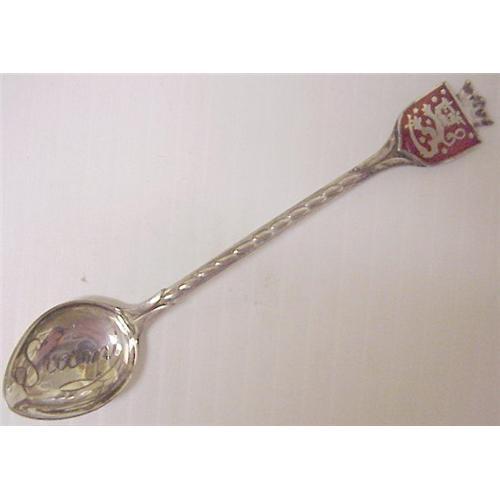 LOVELY STERLING SOUVENIR SPOON , LOVE THE EXCELLENT DETAIL AND ENAMEL WORK - BACK OF THE SPOON IS MARKED 925 .MEASURES ABOUT 4 1/4" LONG, US BUYER PLEASE PAY 7.00 FOR SHIPPING PLUS INSURANCE.THANKS.