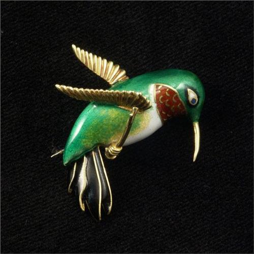 BROOCH: Fanciful 18K yellow gold and enamel humming bird brooch. Appraisal included.