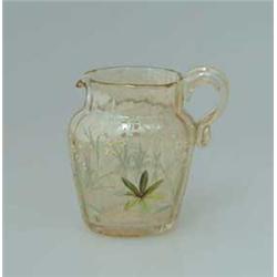 Lot 895 ENAMELED MINIATURE PITCHER. Beautiful miniature pitcher is done in light amber iridescent glass with enamel decoration of green leaves and stem with white and yellow flowers. Applied handle. Appears to be similar to the design and work of Daum Nancy, but is unsigned. SIZE: 2-7/8” t. CONDITION: Small stress fracture in ground pontil, otherwise very good. 5-68593 (200-300)