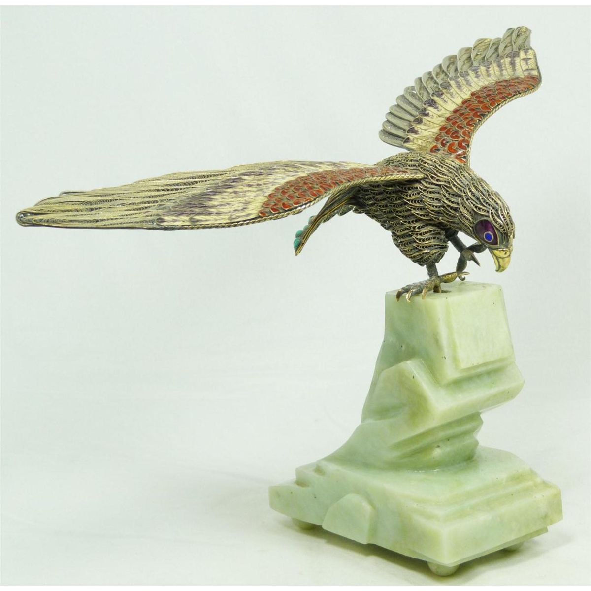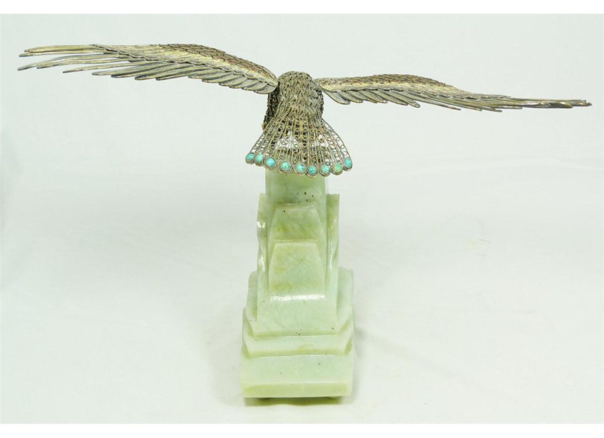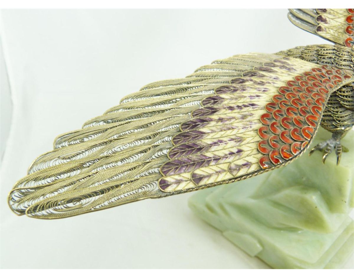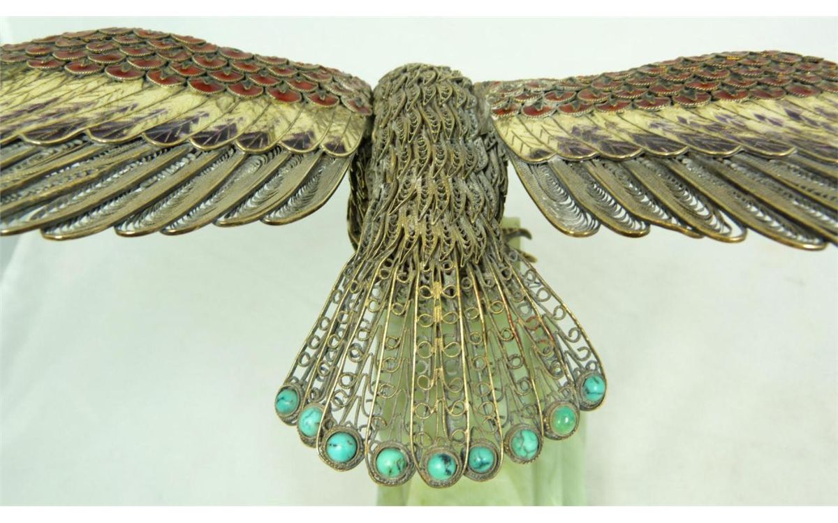 Stunning limited edition enameled Chinese filigree sterling silver eagle figure on rock form jade base. Eagle is depicted with wings abreast. 9 round cabochon cut turquoise stones to tail feathers. Has mounted plaque to bottom. Measures 4" height x 13" width + 5" base height (10.1cm x 33cm + 12.7cm). Numbered 454/500. Silver weight of 10.66ozt. Total weight of 1447 grams.