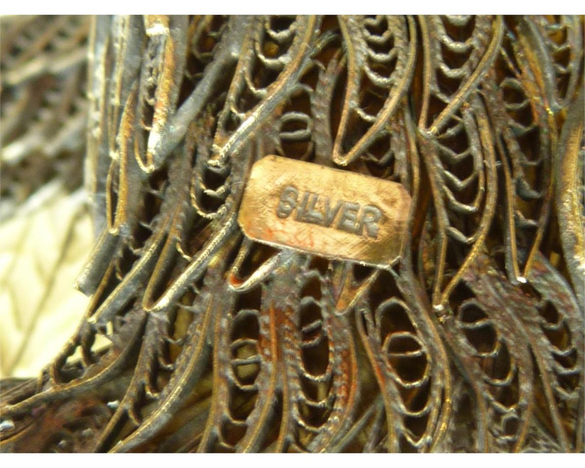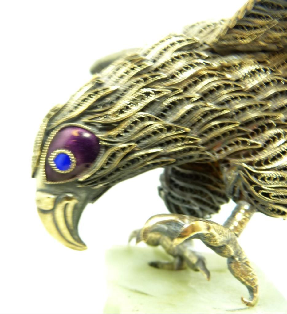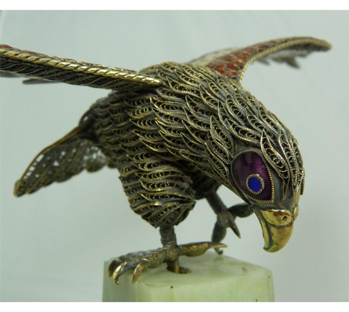 Stunning limited edition enameled Chinese filigree sterling silver eagle figure on rock form jade base. Eagle is depicted with wings abreast. 9 round cabochon cut turquoise stones to tail feathers. Has mounted plaque to bottom. Measures 4" height x 13" width + 5" base height (10.1cm x 33cm + 12.7cm). Numbered 454/500. Silver weight of 10.66ozt. Total weight of 1447 grams.