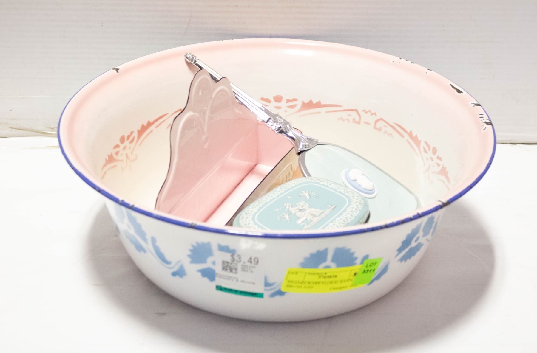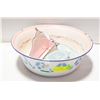 ENAMELWARE FLORAL BASIN, BRUSH AND