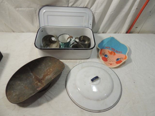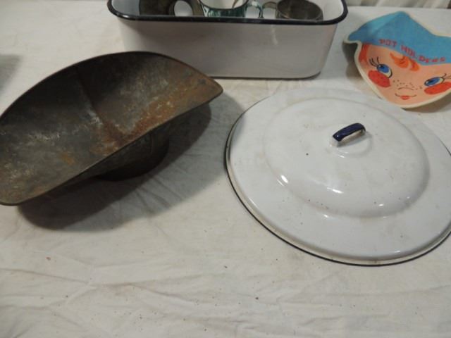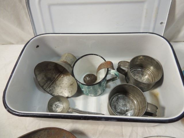 AS SHOWN, PRIMITIVE LOT KITCHEN CUPS SPATTERWARE, ETC. AS SHOWN.