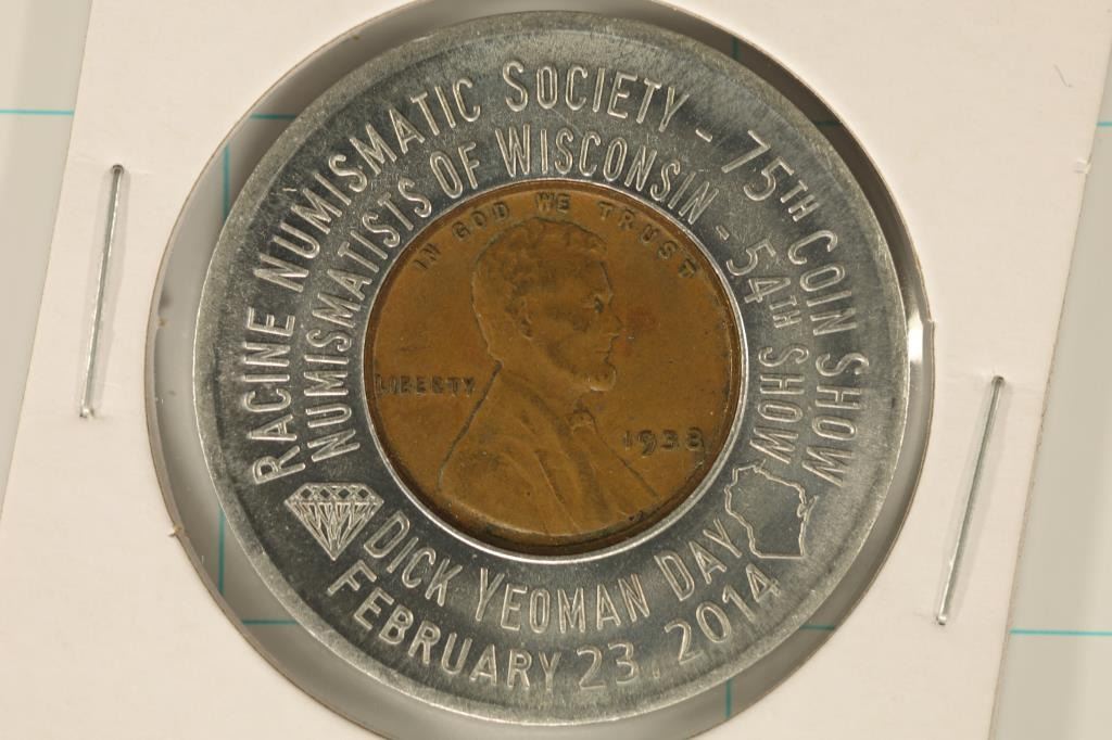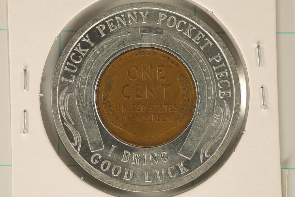 NUMISMATIC SOCIETY 75TH COIN SHOW" ON THE OBVERSE AND "LUCKY PENNY POCKET PIECE, I BRING GOOD LUCK" ON THE REVERSE.