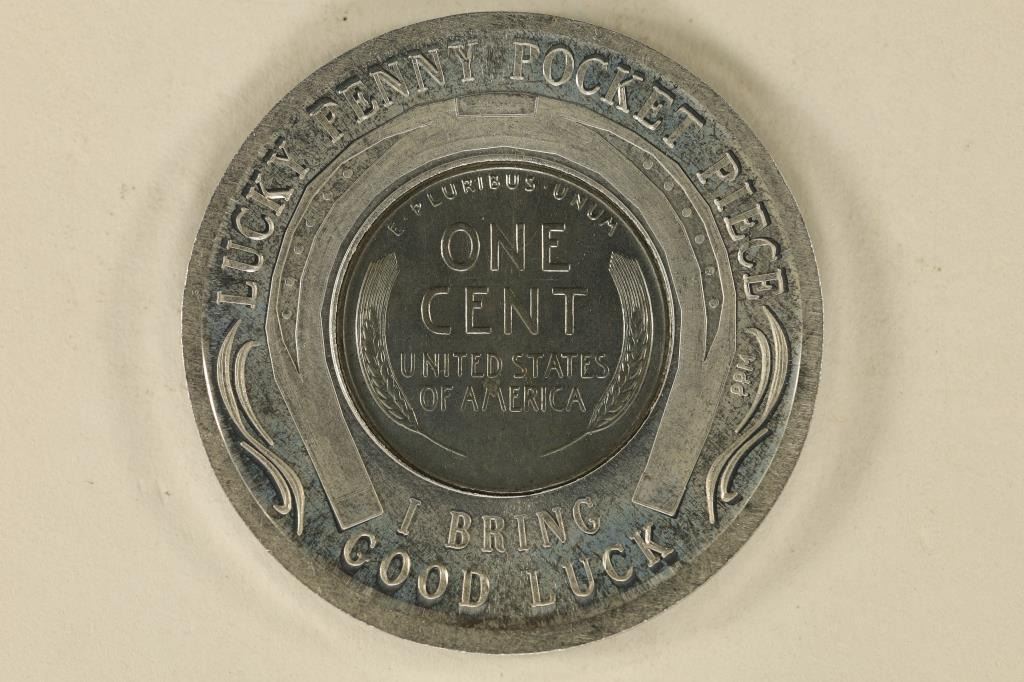 COLLECTORS INTERNATIONAL" ON THE OBVERSE AND "LUCKY PENNY POCKET PIECE, I BRING GOOD LUCK" ON THE REVERSE