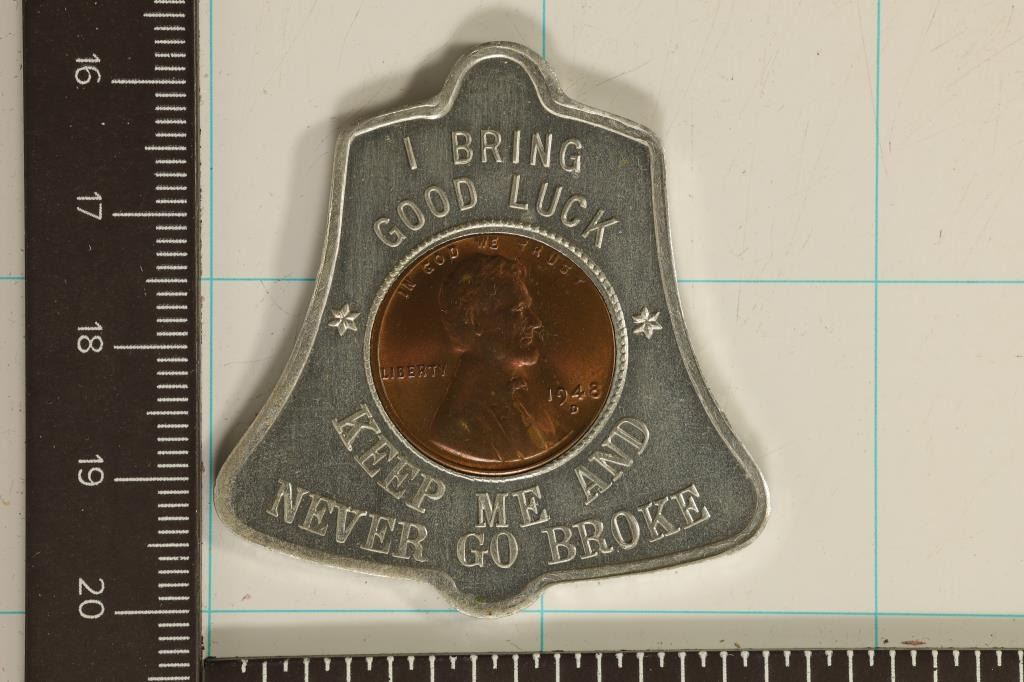 I BRING GOOD LUCK, KEEP ME AND NEVER GO BROKE ON THE OBVERSE AND LIBERTY BELL'S DINNER HOUSE ON THE REVERSE