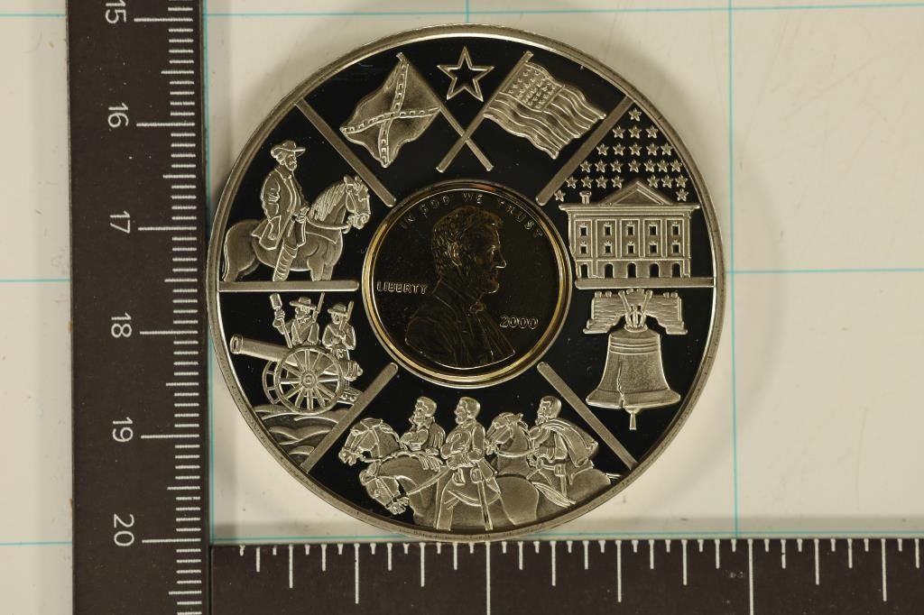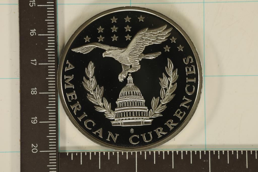 SILVER COLORED AMERICAN CURRENCIES PROOF ROUND IN HARD PLASTIC CAPSULE.